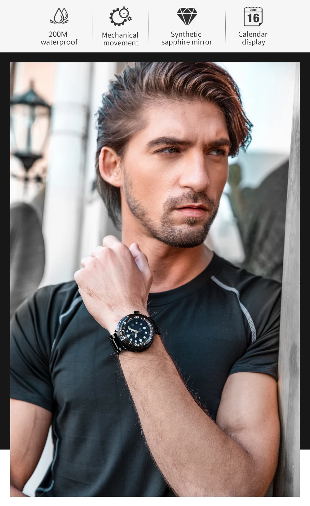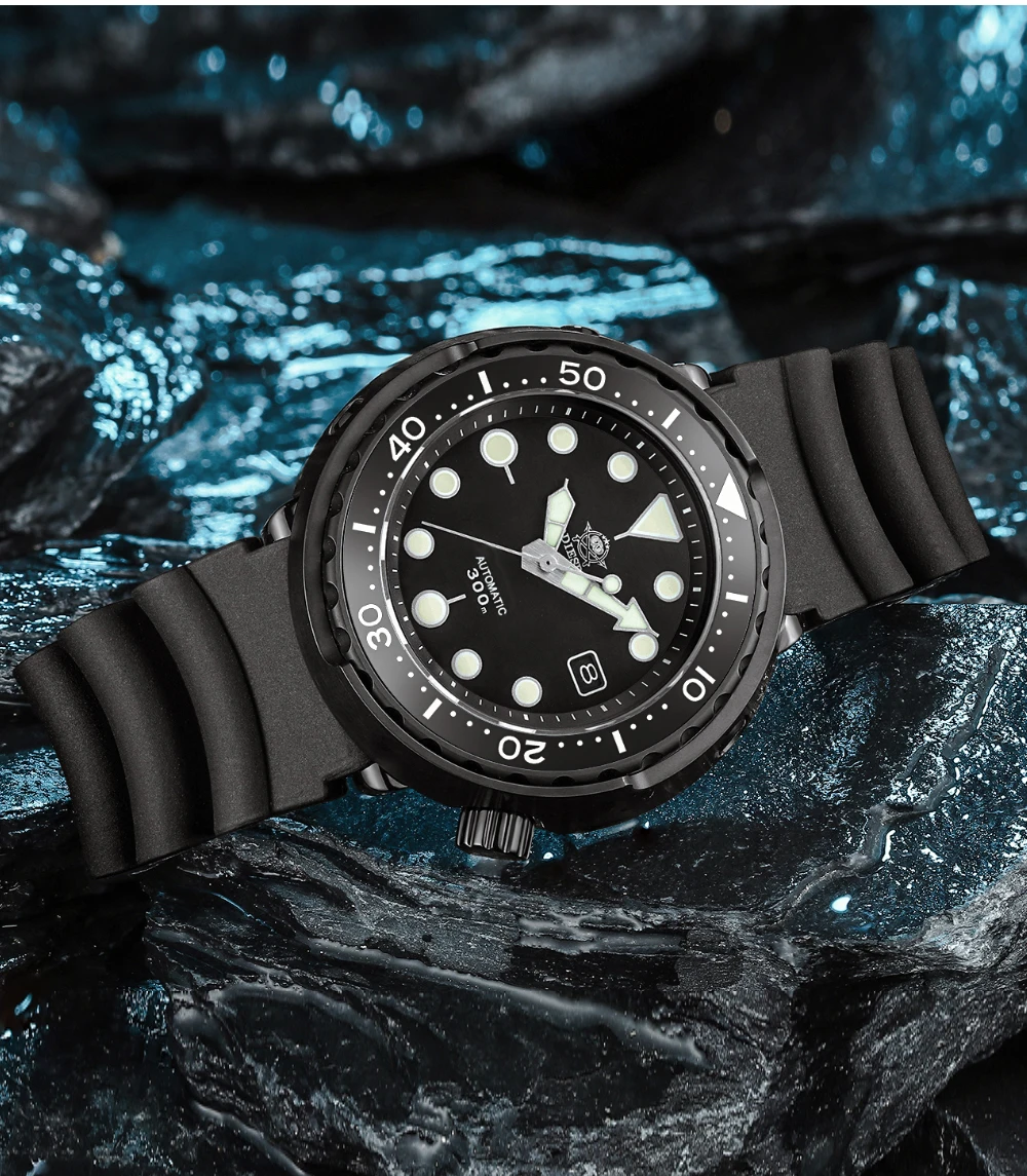 Quando você coloca esse relógio no pulso, a percepção muda — a sua, e a de todos ao seu redor. Ele combina um visual agressivo com uma engenharia impecável, trazendo a essência dos lendários diver watches para o seu dia a dia.