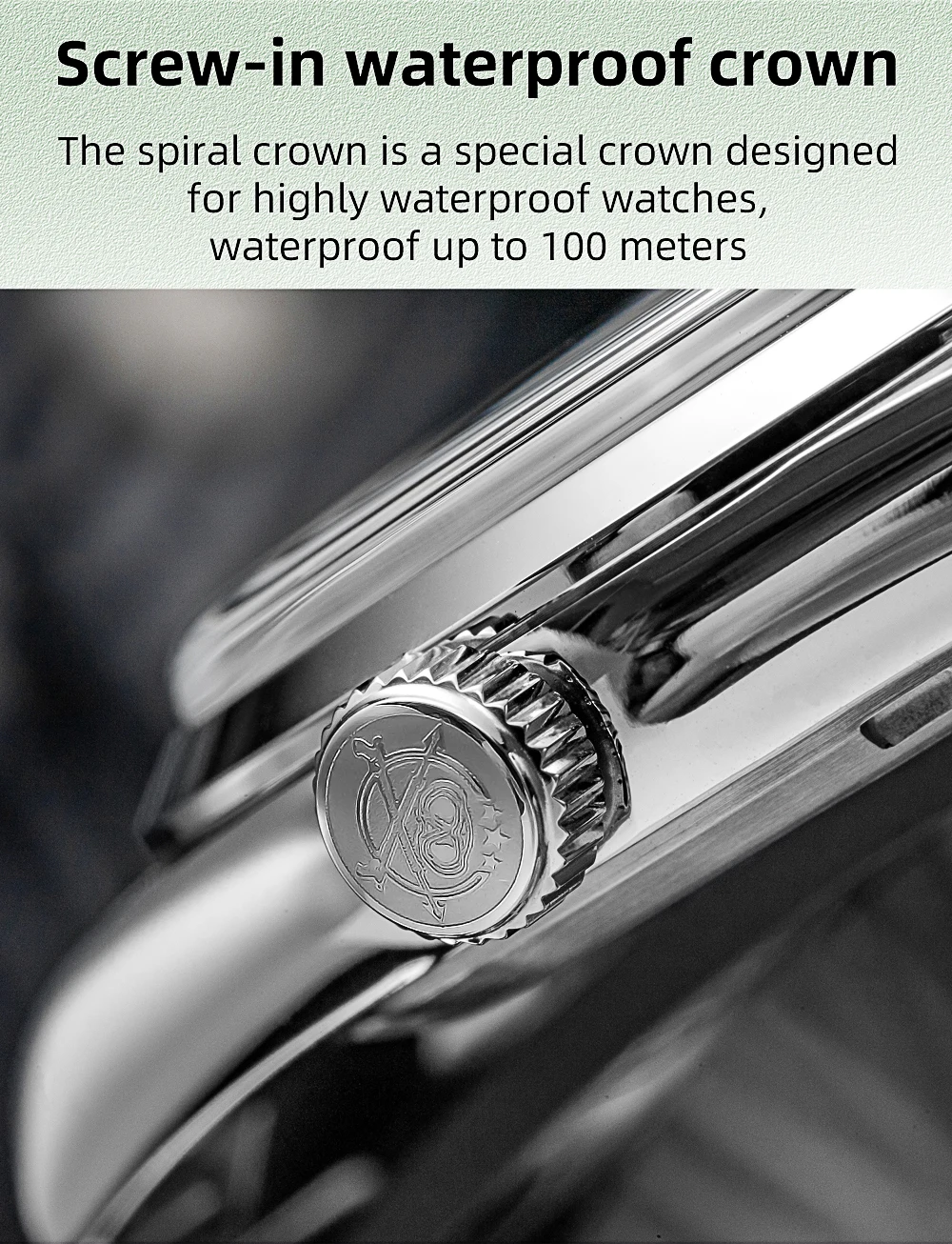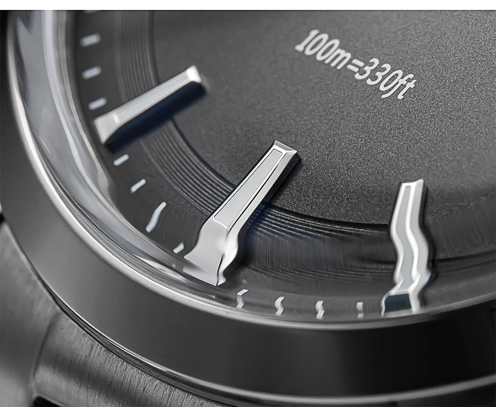 A caixa e a pulseira em aço inoxidável 316L, combinadas com coroa e fundo rosqueados, garantem durabilidade e resistência à água de até 100 metros, permitindo uso diário com tranquilidade.