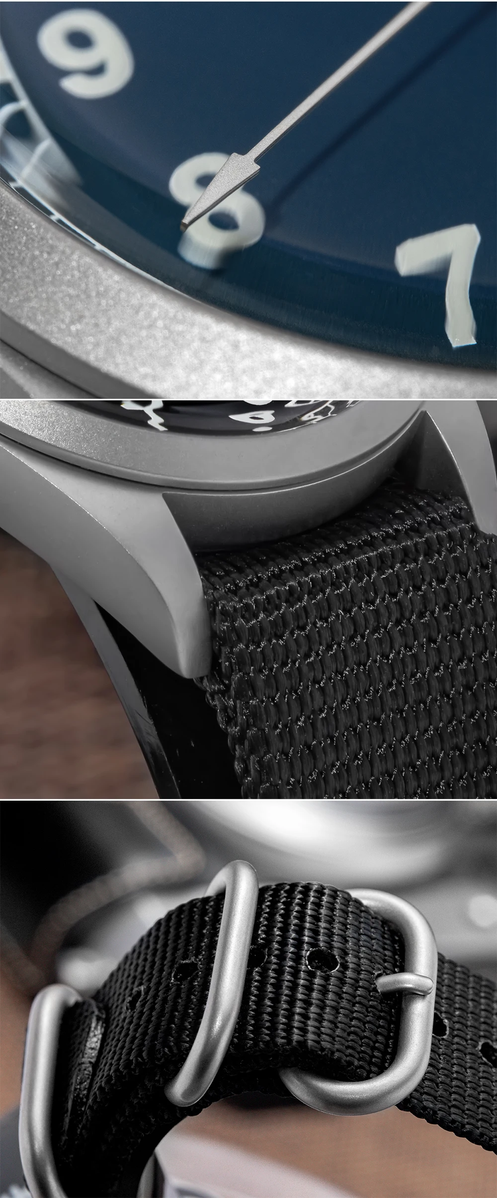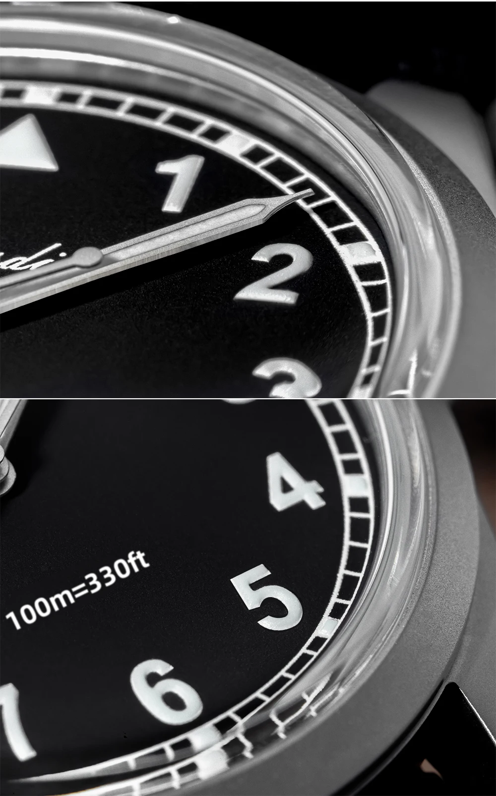 Numerais arábicos bem definidos, ponteiros precisos e lume forte garantem leitura imediata, seja sob sol forte, baixa luminosidade ou escuridão total. Um relógio funcional, direto e confiável — exatamente como um field watch deve ser.