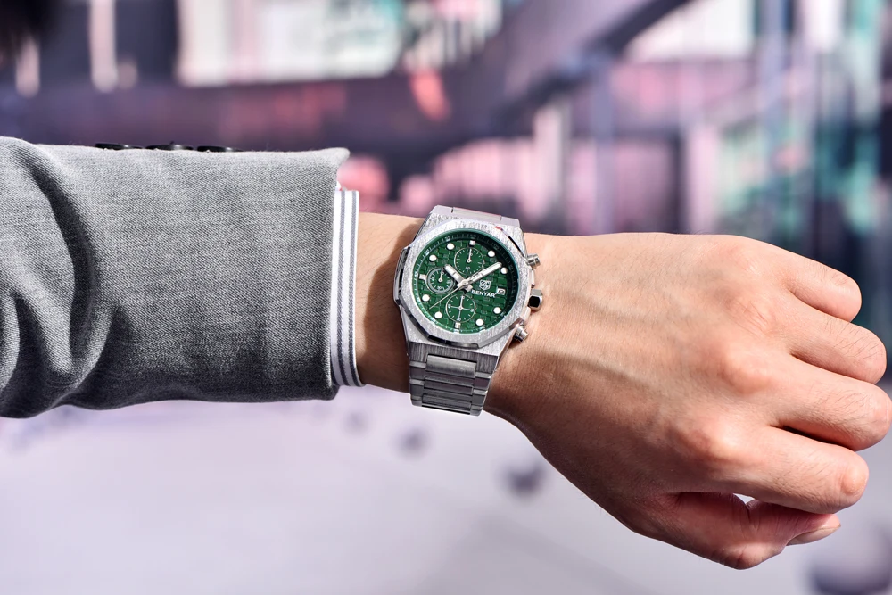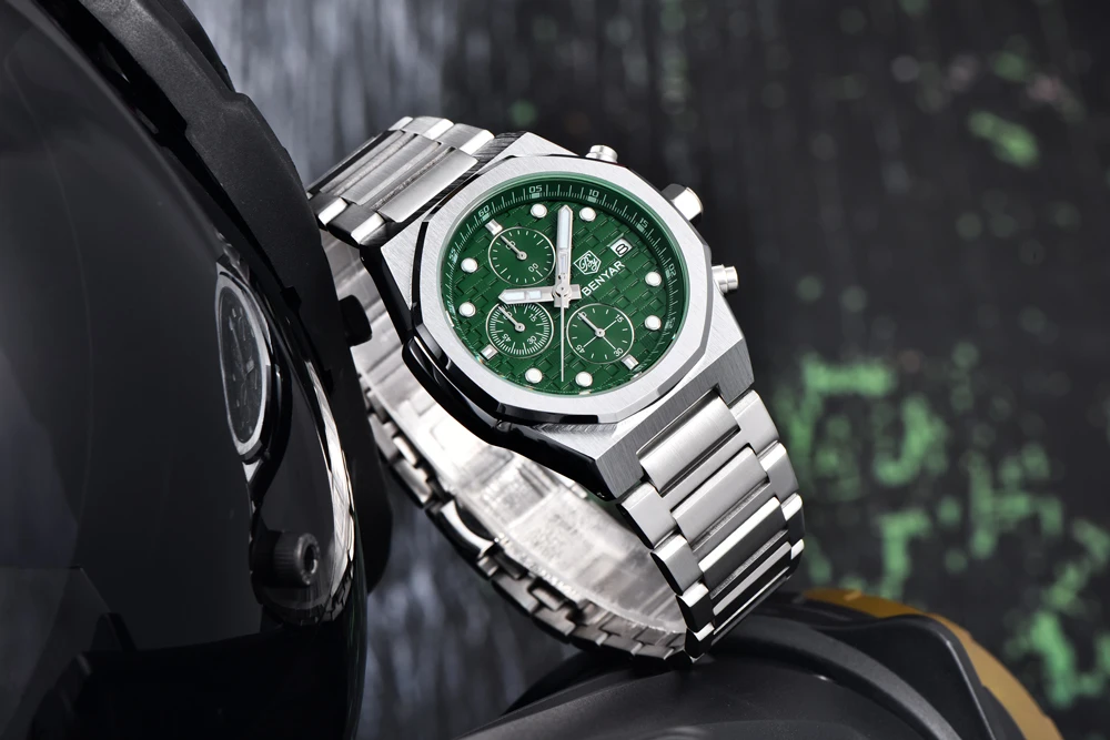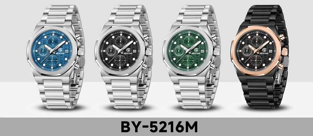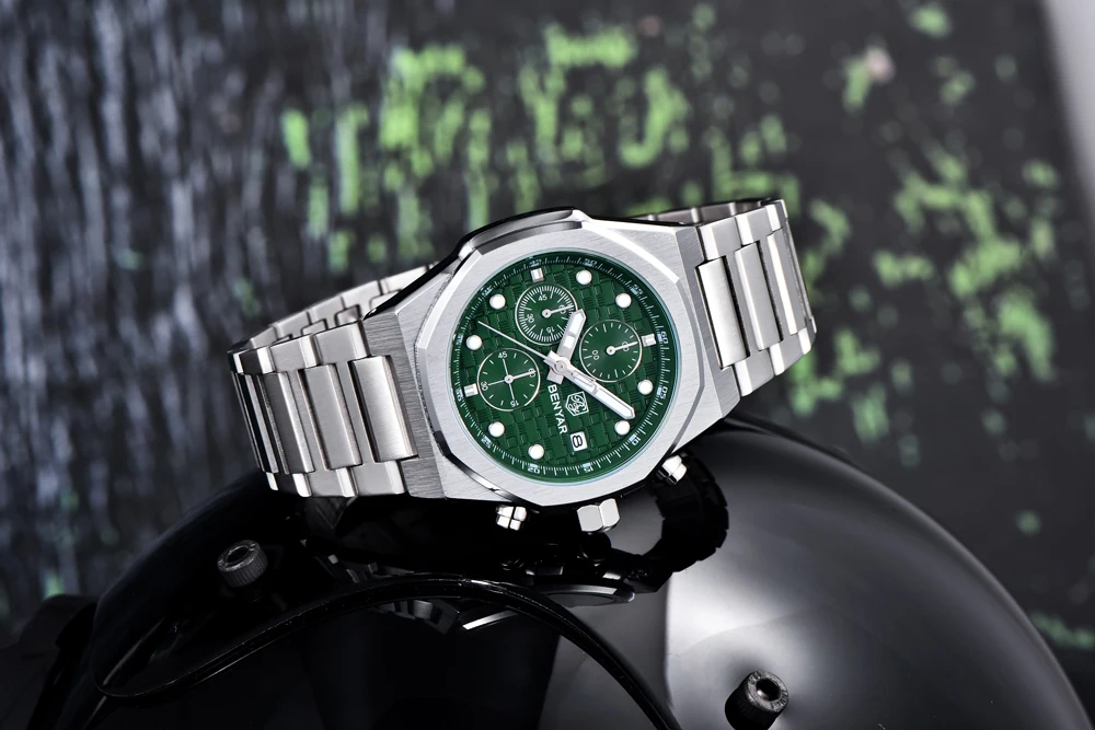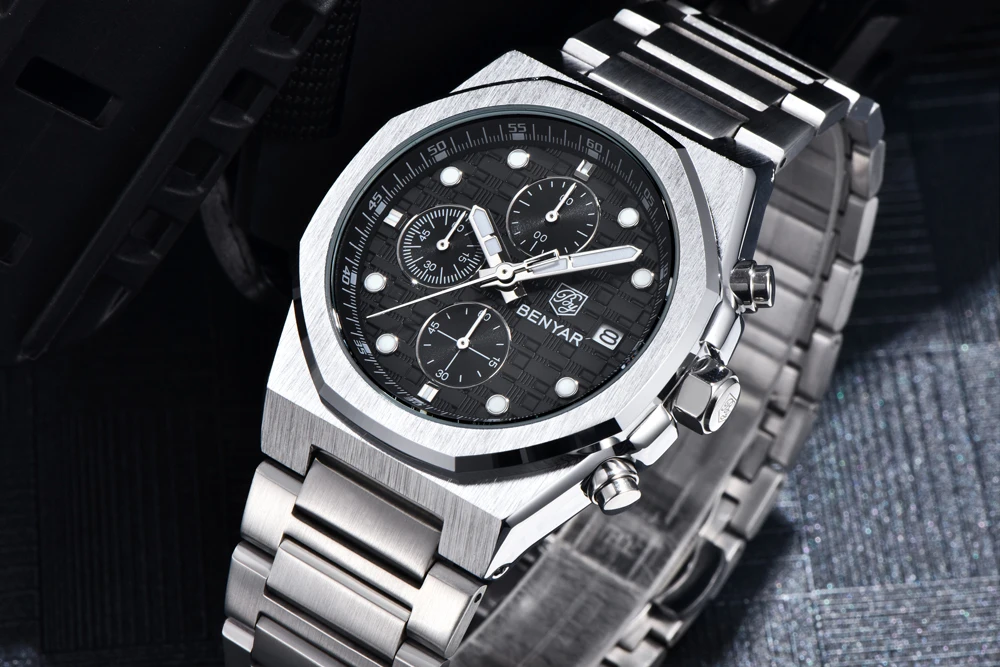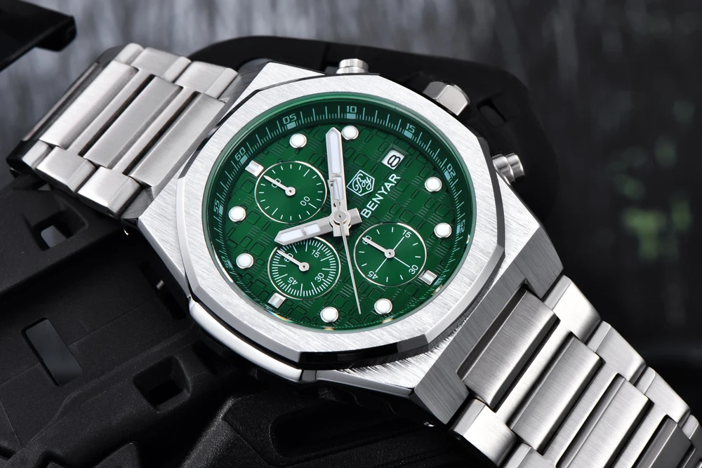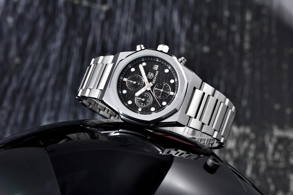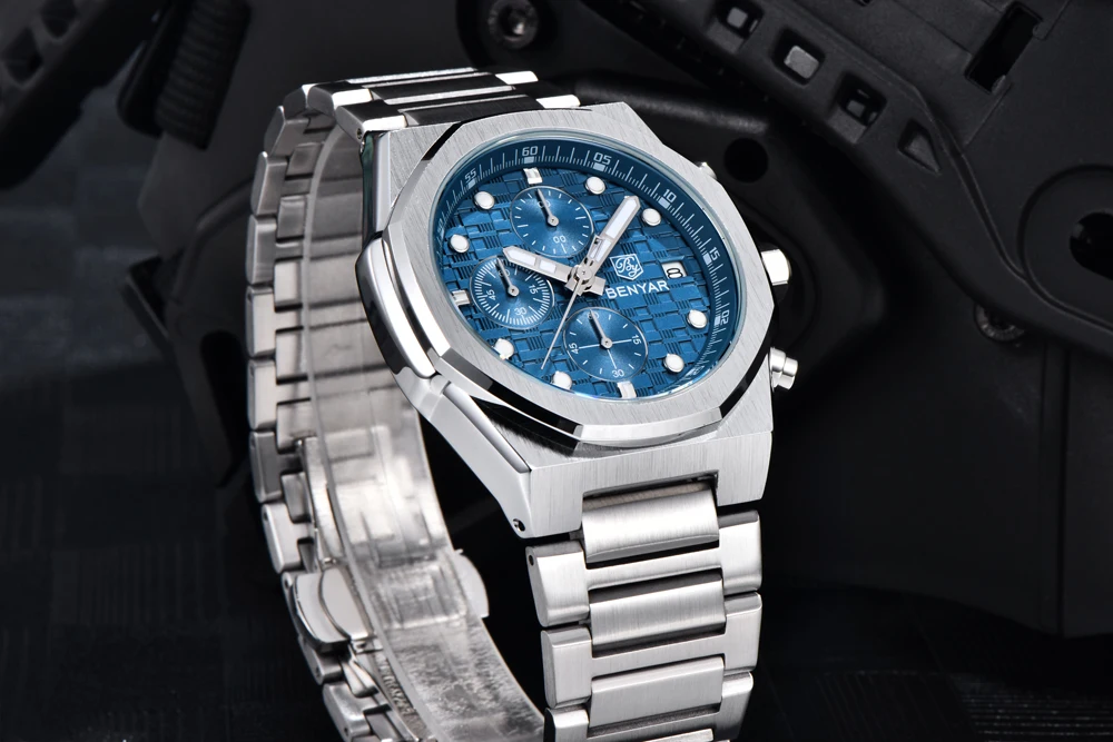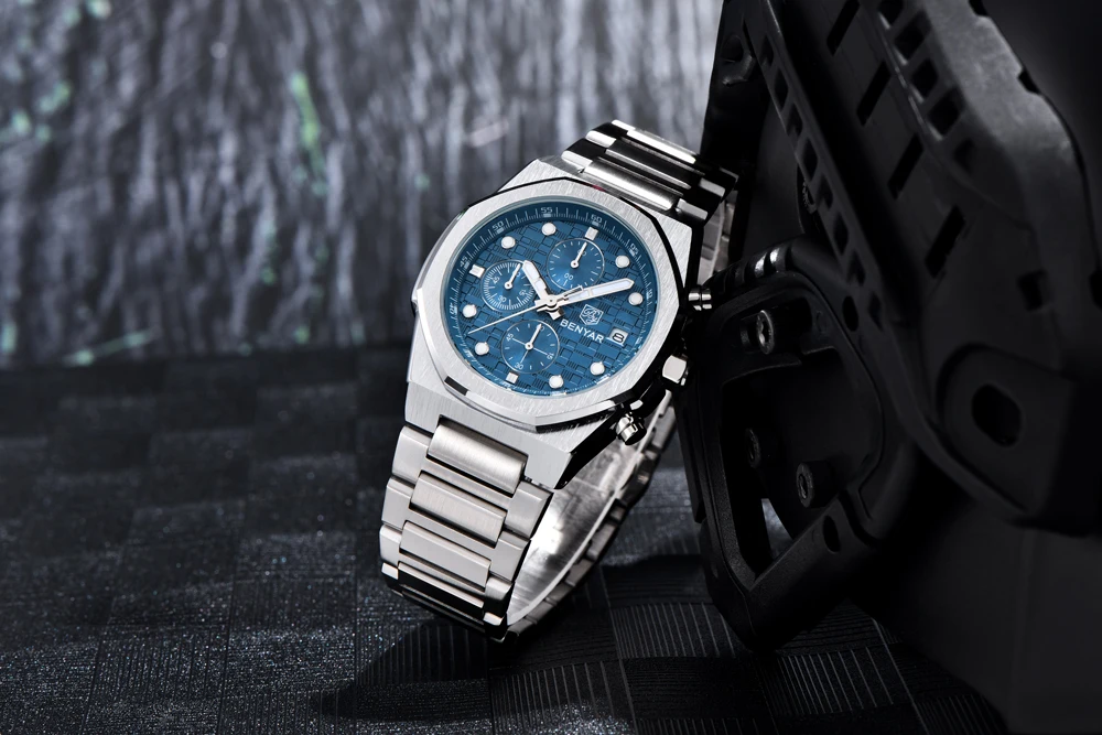 Com caixa de 40–42 mm, acabamento refinado e pulseira em aço inoxidável ou couro, o Benyar Chronograph combina elegância e esportividade na medida certa. Seu mostrador robusto, combinado ao brilho discreto do vidro mineral endurecido, cria uma presença marcante que levanta seu visual instantaneamente.