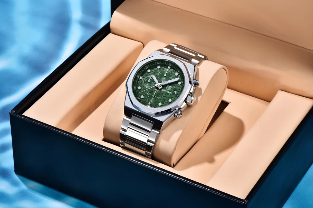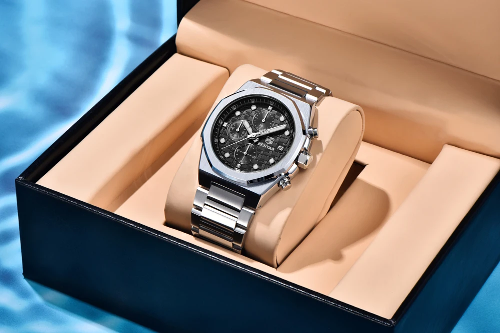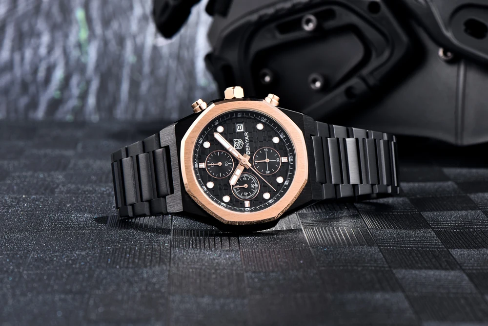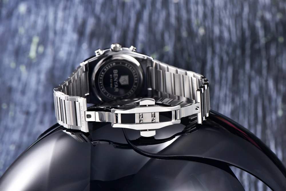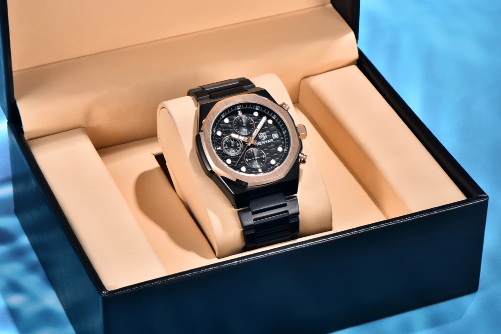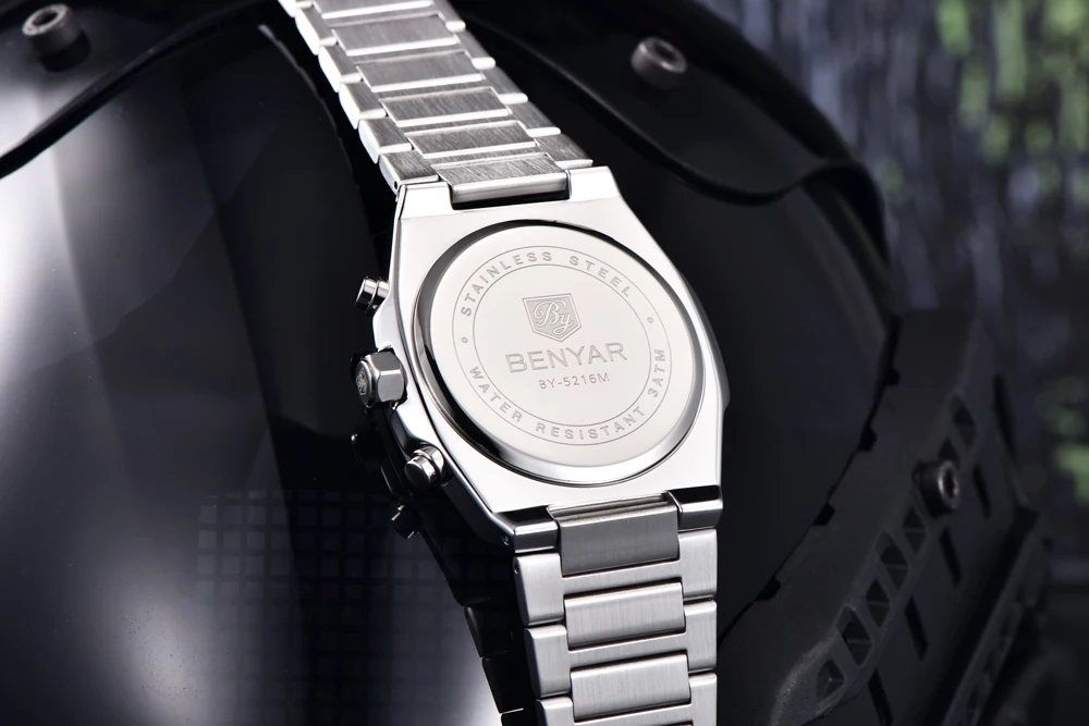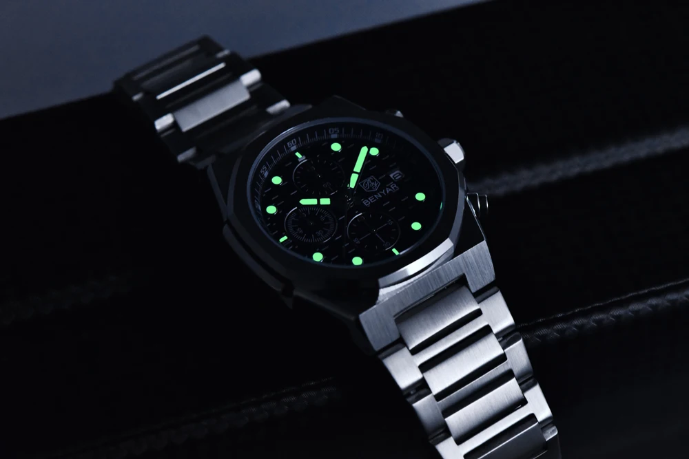 Equipado com movimento de quartzo japonês, o Benyar Chronograph entrega exatidão milimétrica em todos os momentos. Diferente de relógios comuns, ele mantém o tempo perfeitamente alinhado, dando a você mais controle, confiança e organização ao longo do dia.
