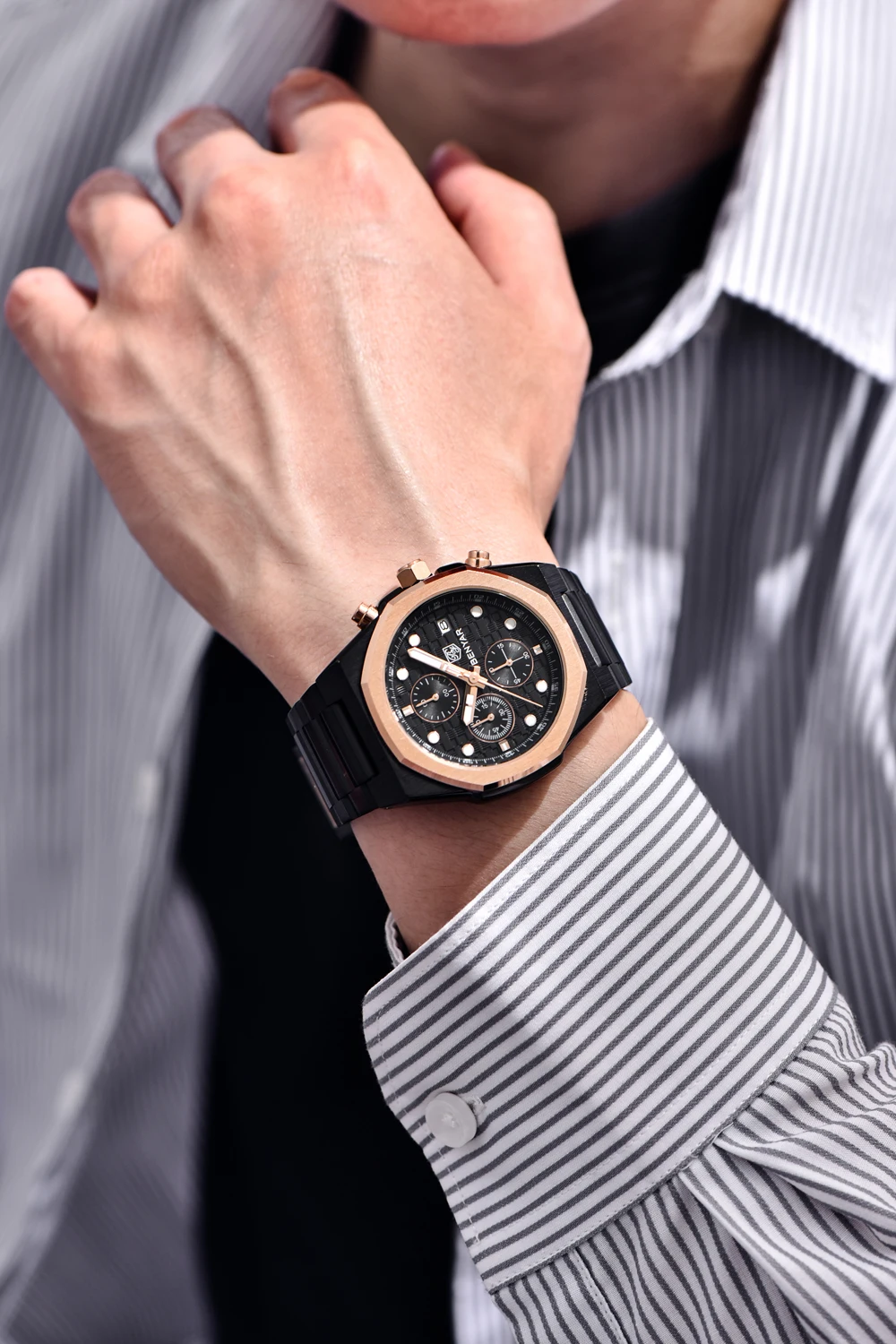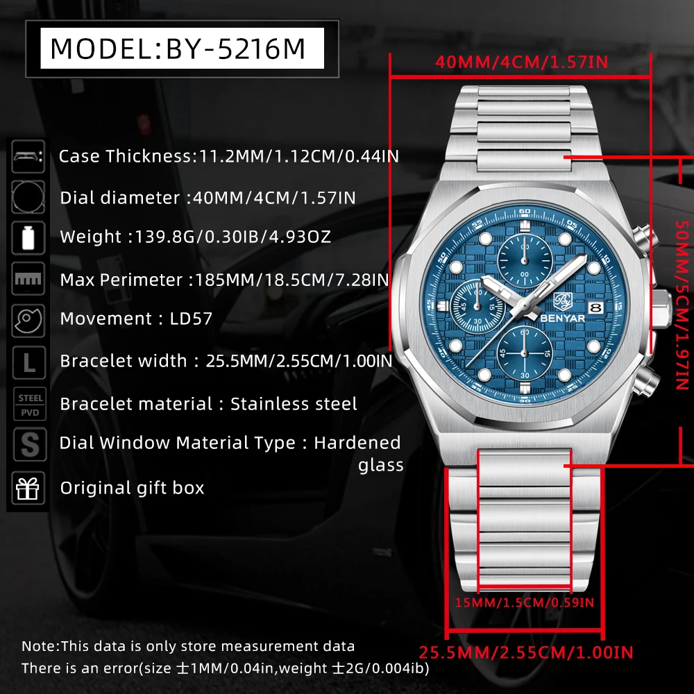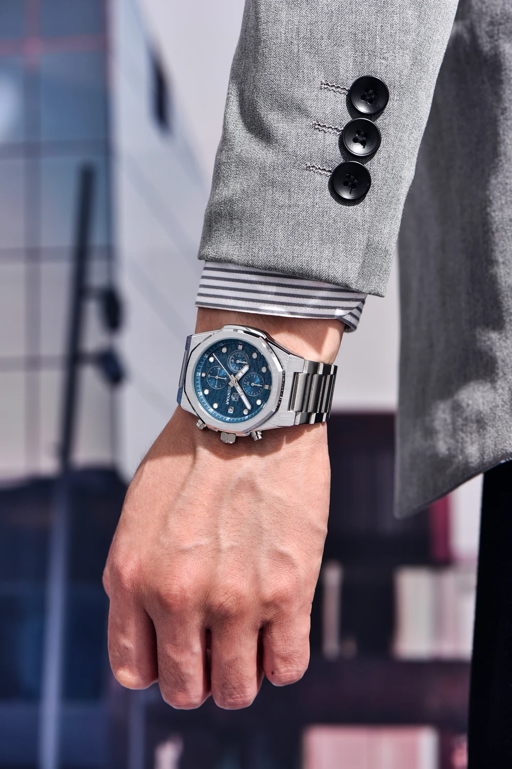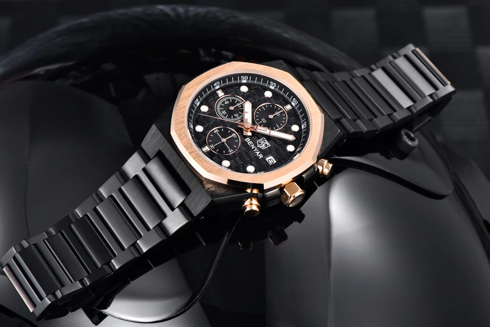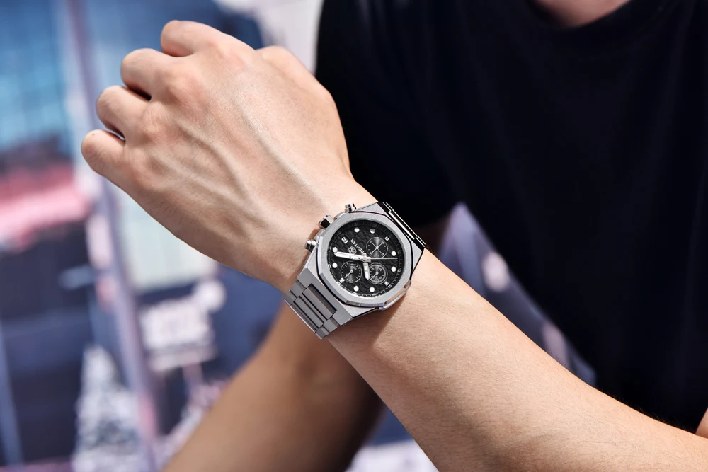 Equipado com movimento de quartzo japonês, o Benyar Chronograph entrega exatidão milimétrica em todos os momentos. Diferente de relógios comuns, ele mantém o tempo perfeitamente alinhado, dando a você mais controle, confiança e organização ao longo do dia.