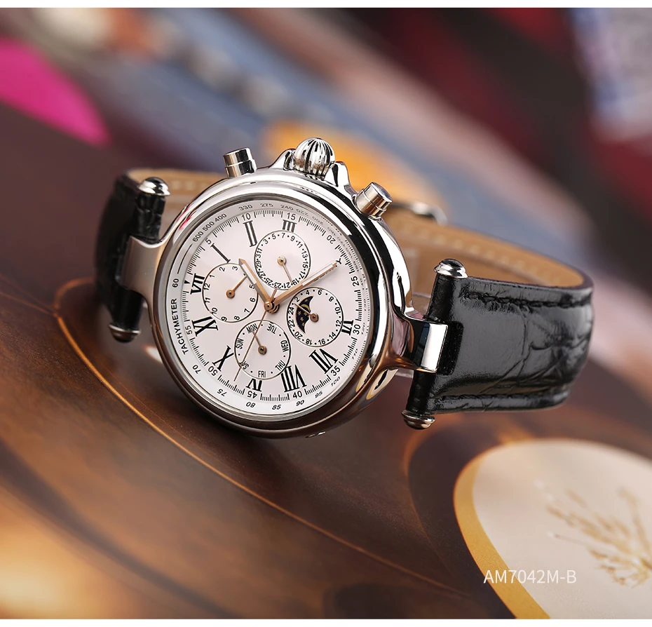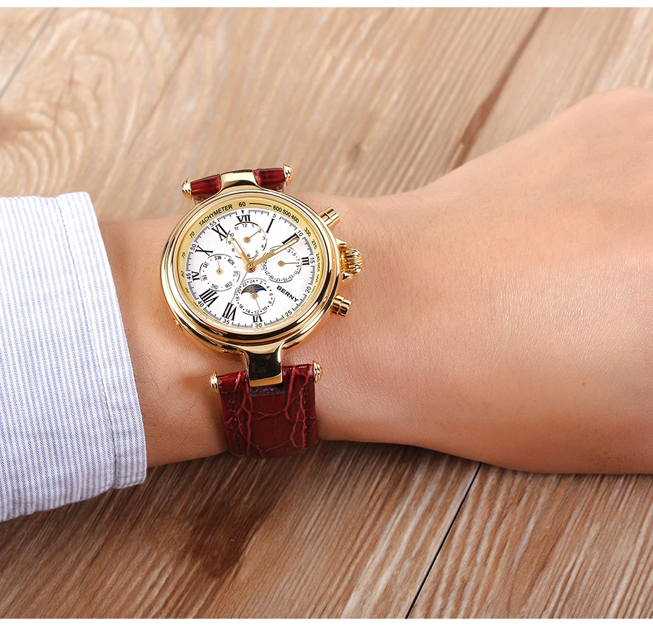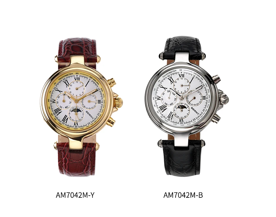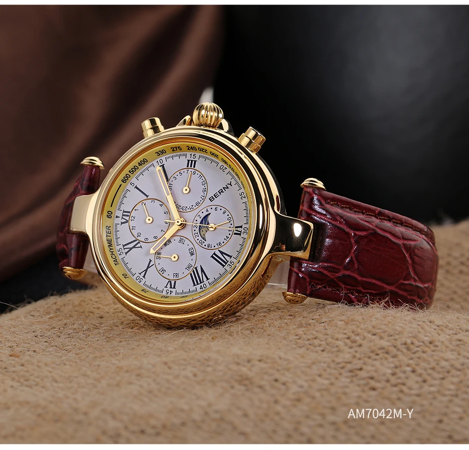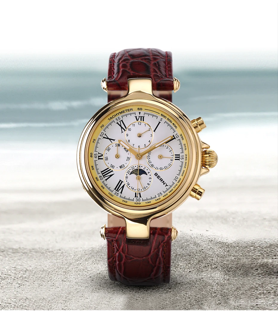 O Berny Full Calendar vai muito além do básico: ele reúne em um único mostrador informações essenciais como mês, dia da semana, data e indicador 24h com sol e lua. Tudo isso combinado com um design clássico e sofisticado, inspirado em relógios de luxo vintage, que transforma qualquer look com presença e elegância.