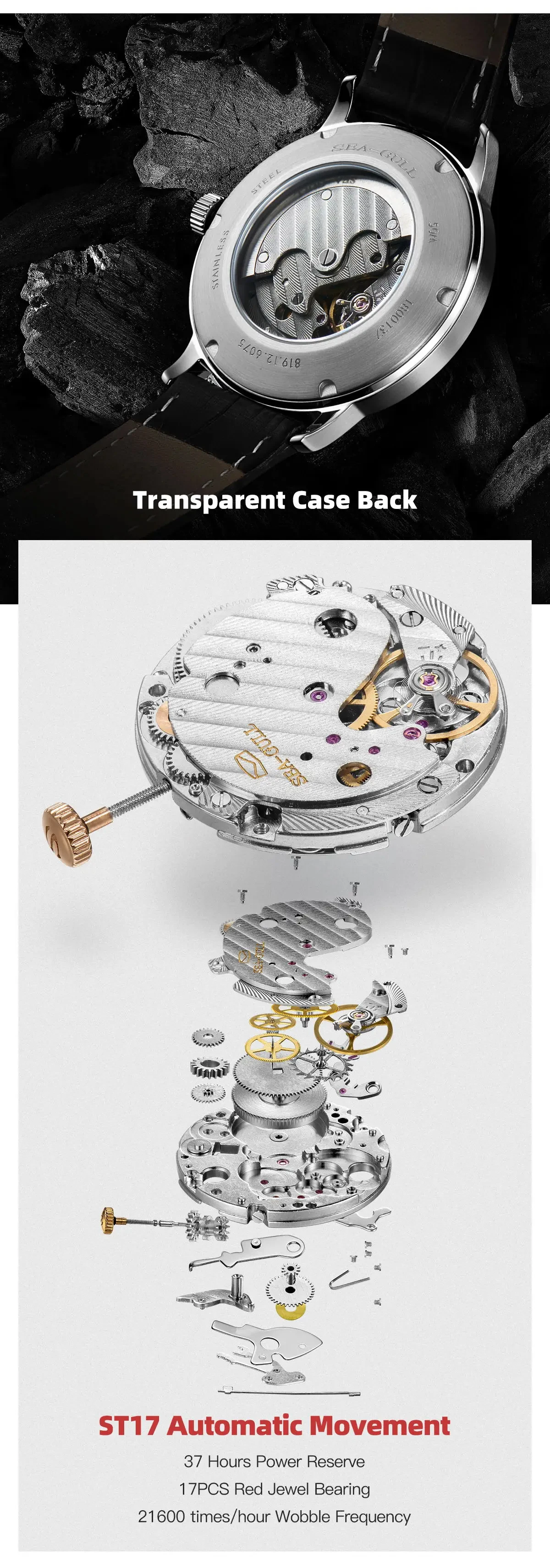 O coração do relógio é o movimento automático Seagull ST2528, visível através do fundo transparente. Cada batida, cada engrenagem, cada detalhe polido reforça a sensação de possuir algo vivo no pulso. Sem bateria, sem descartável — apenas engenharia mecânica de verdade.