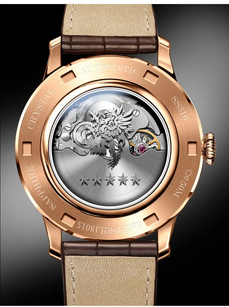 Seu movimento automático dispensa bateria e funciona com o movimento natural do seu braço. O fundo transparente permite observar cada detalhe da engrenagem, reforçando o valor mecânico e a exclusividade de um verdadeiro relógio de luxo.