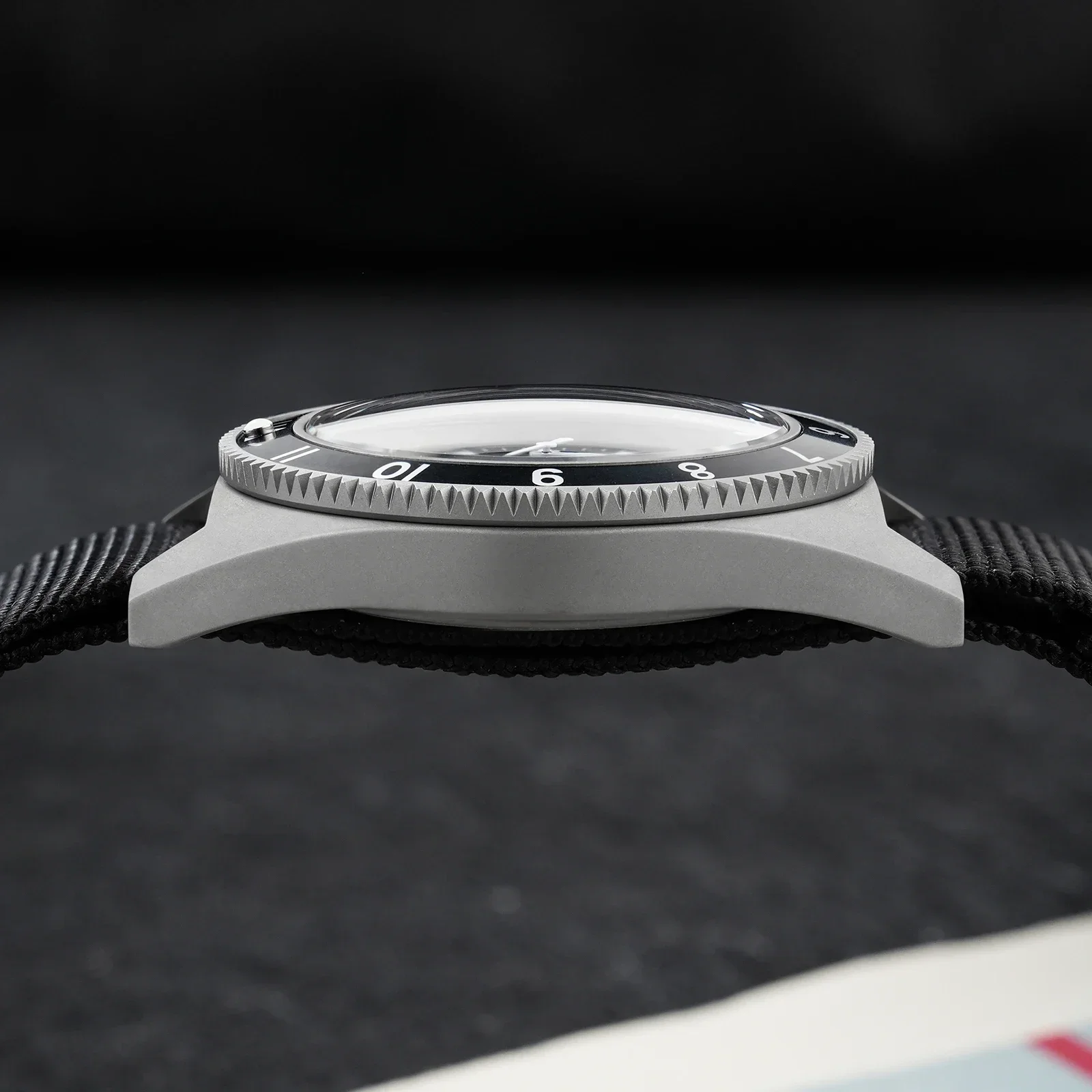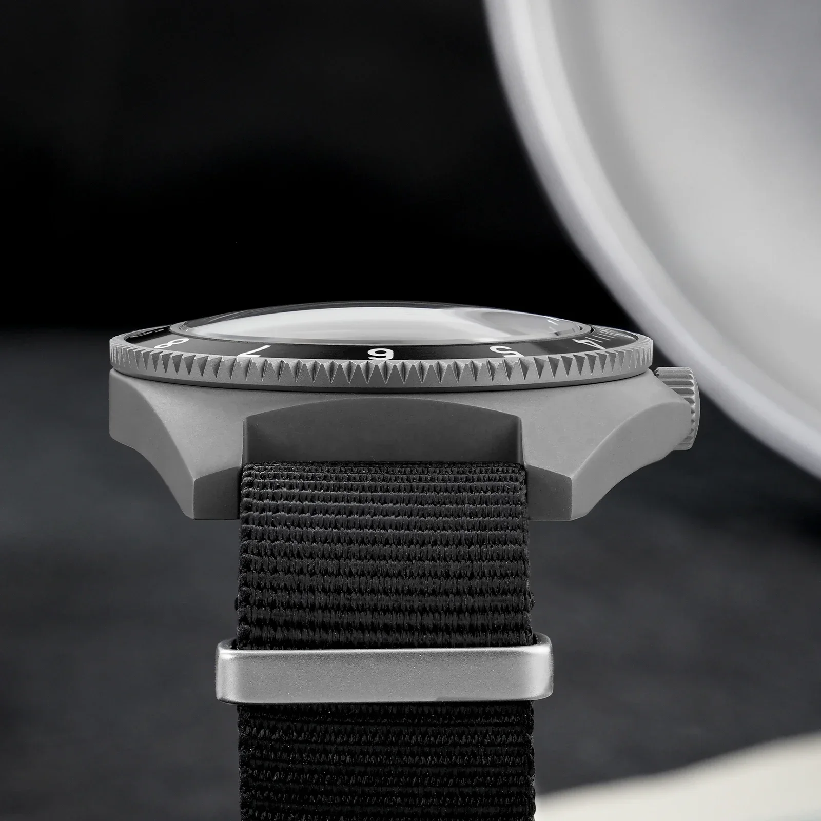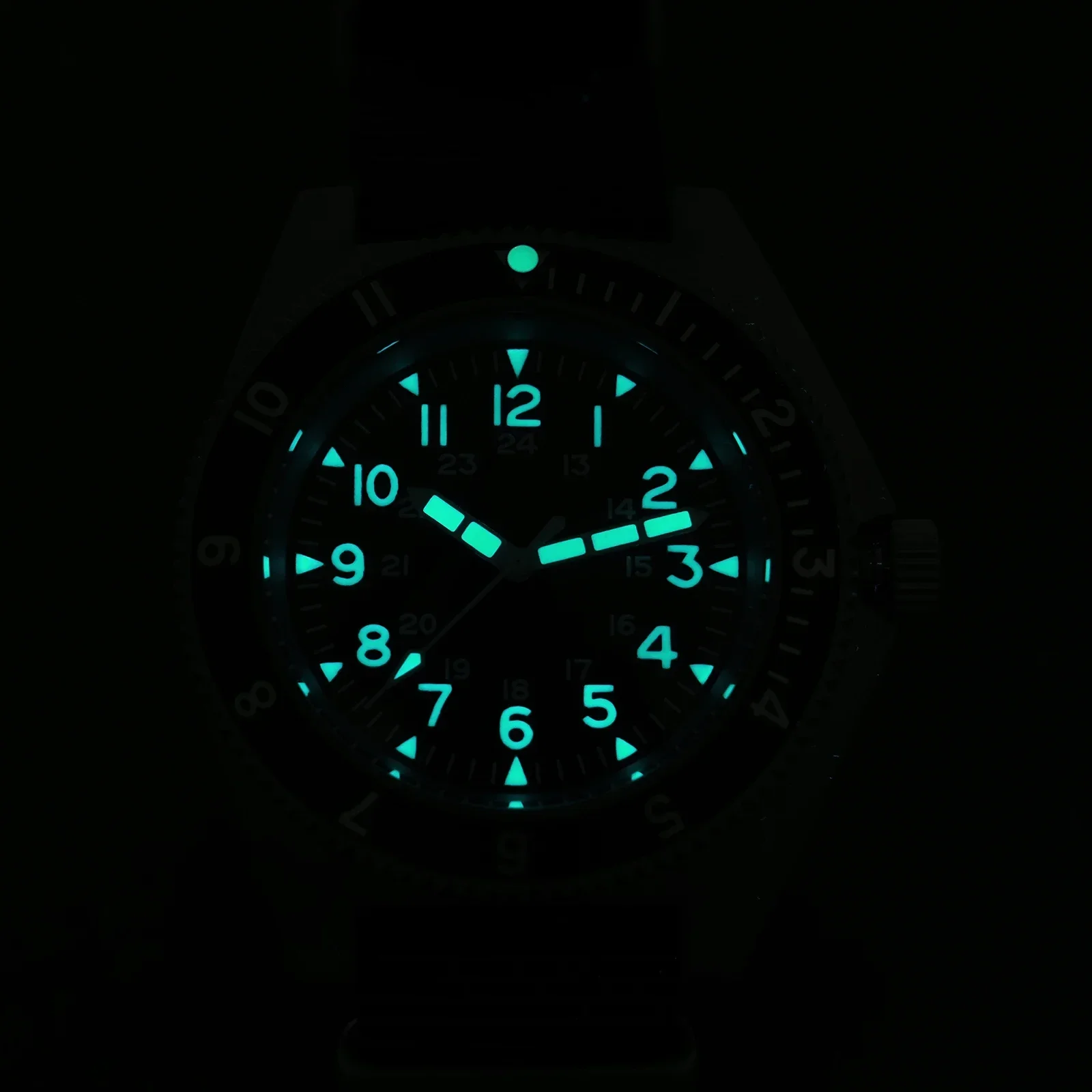 O mostrador limpo e funcional, aliado ao BGW9 Super-LumiNova nos ponteiros e marcadores, garante leitura imediata mesmo no escuro absoluto. É um relógio feito para ser visto rápido — exatamente como um instrumento militar deve ser.