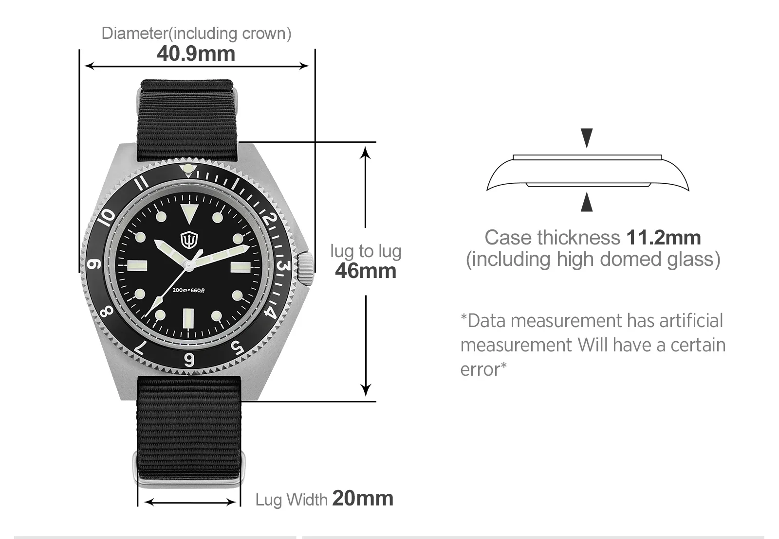 A caixa em aço inoxidável 316L com acabamento jateado, a coroa rosqueada e a resistência à água de 200 metros (20 ATM) fazem deste relógio um verdadeiro instrumento. Ele está pronto para mergulho, trilhas, trabalho pesado ou uso diário sem qualquer preocupação.
